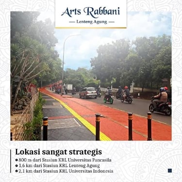 ARTS Rabbani berlokasi di Lenteng Agung – Jakarta Selatan, dilengkapi oleh fasilitas-fasilitas umum seperti Tol Lenteng Agung 2, Stasiun KRL, Terminal, Rumah Sakit, Mall, dll. Bukan hanya itu, akses yang sangat mudah juga menjadi nilai tambah untuk ARTS Rabbani, seperti selangkah menuju jalan utama yang dapat mempersingkat/menghemat waktu perjalanan Anda ke tempat tujuan yang Anda butuhkan.